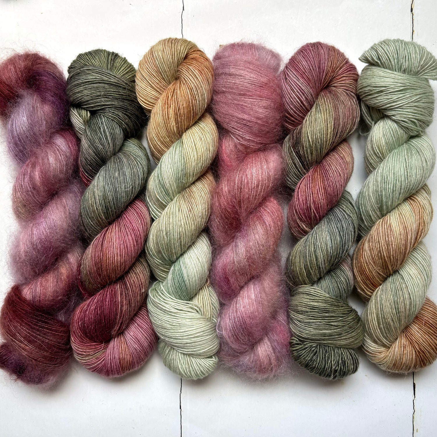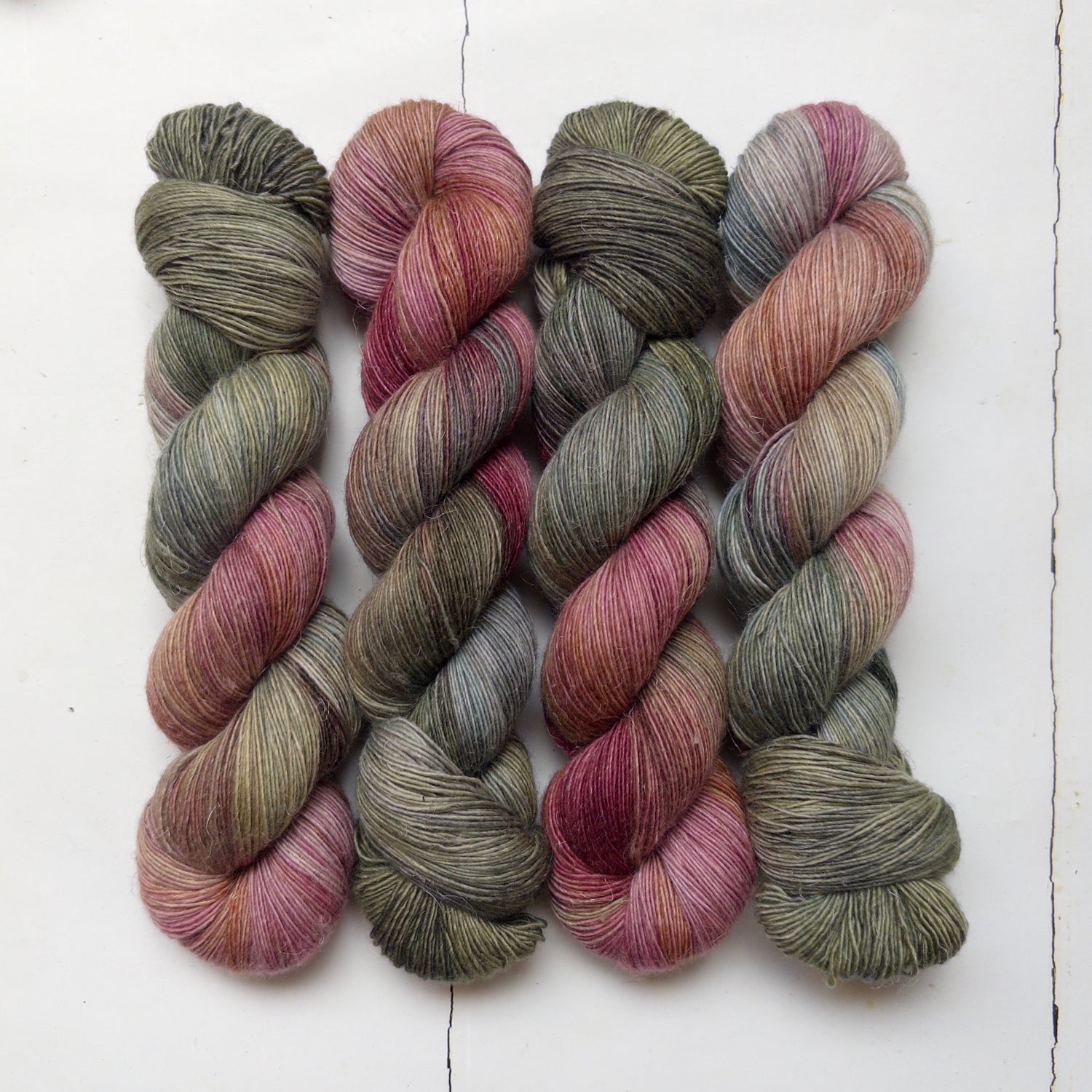 alpine summer is a fluid pastel blend of rosy pink, taupe, soft grassy green, and palest lavender. Inspired by Edith's hot summer hike up a sun-baked Italian hill, with views across to the still snow-tipped alps.