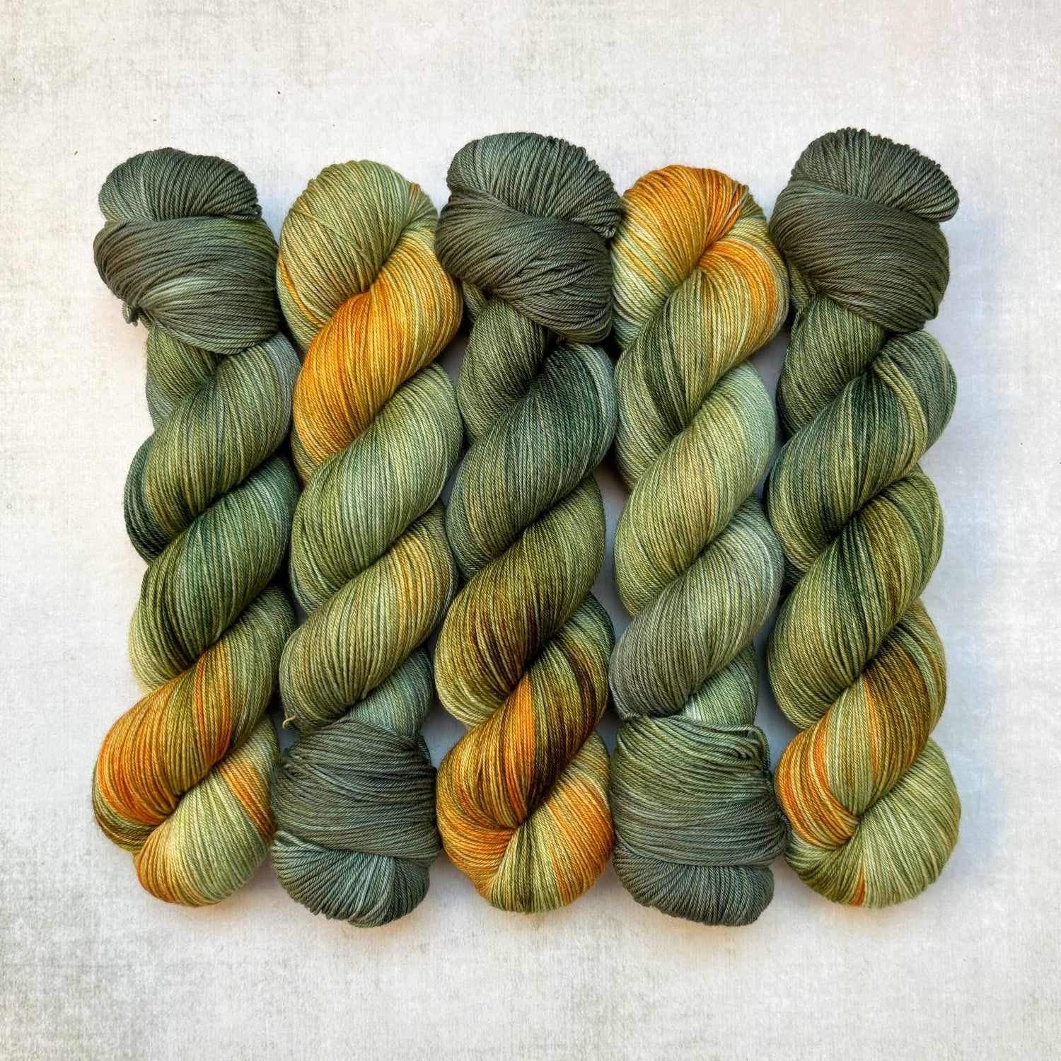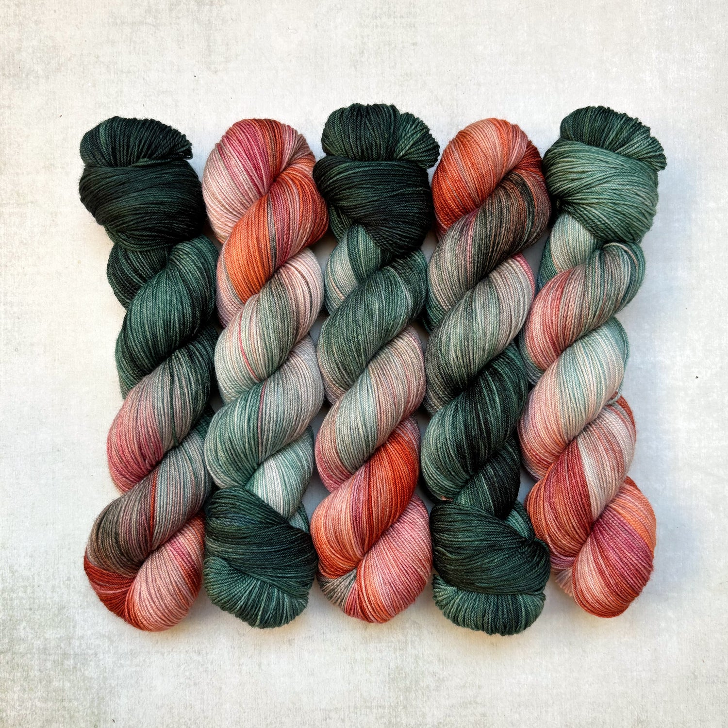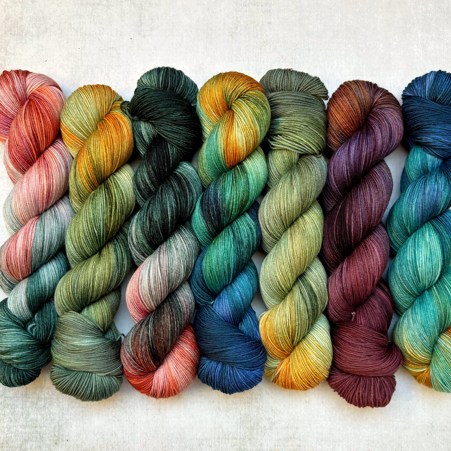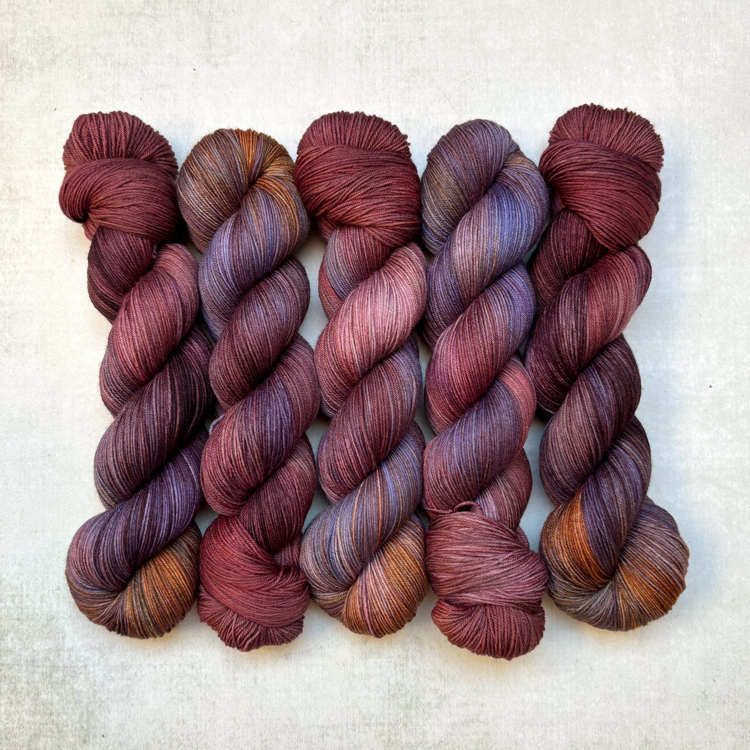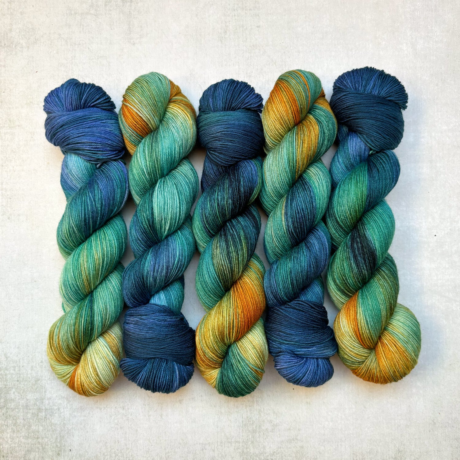 I'm using my favourite fluid space-dyed-with-a-flash technique to create a series of richly saturated shades with light-filled highlights. Each batch is a one-off and while something similar might appear in the next batch of shades, the techniques and process involved means they'll never be quite the same!