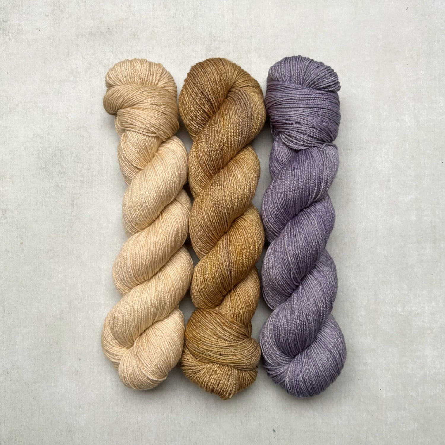 The yarn pack contains 3 x 100g skeins in the following shades: