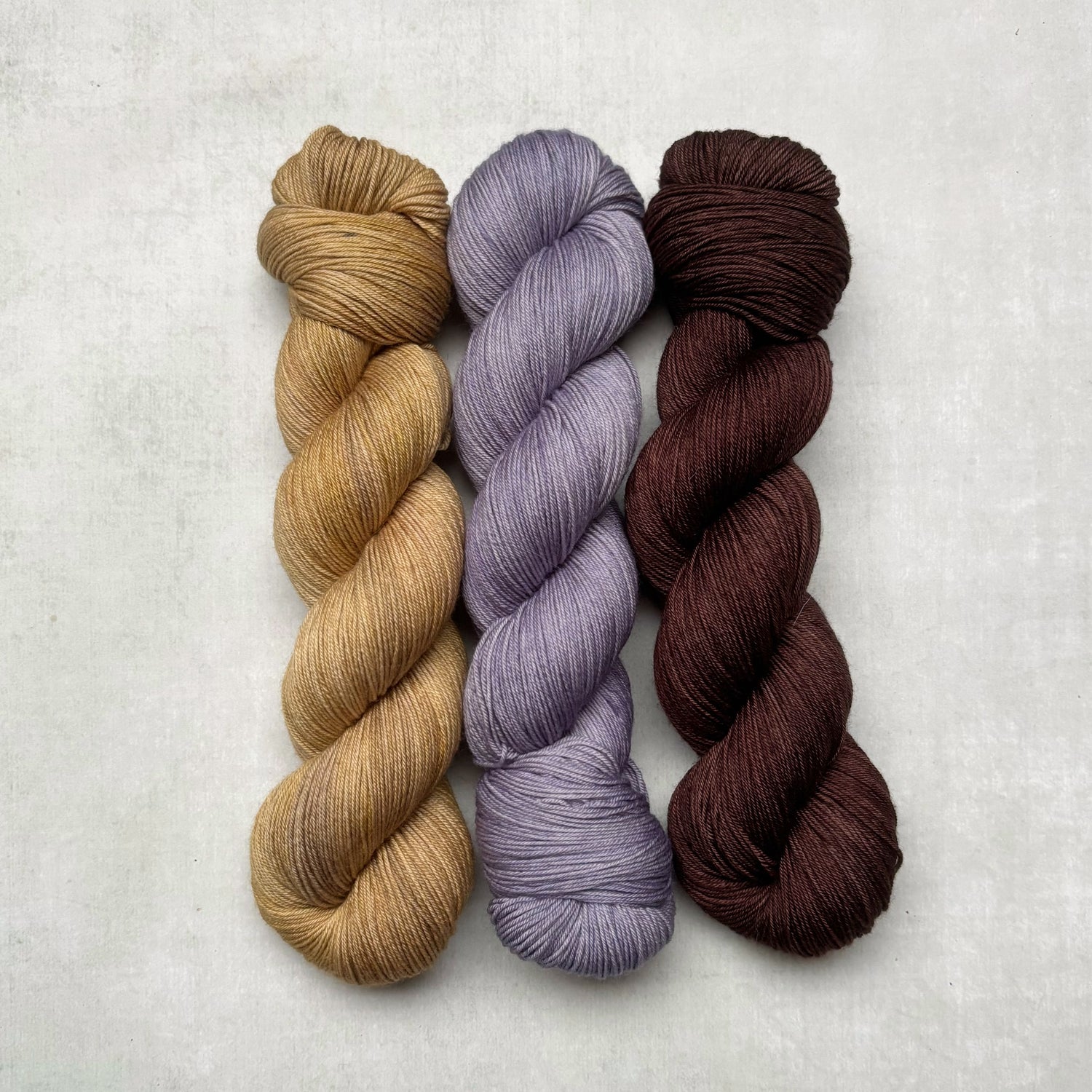 The yarn pack contains 3 x 100g skeins in the following shades: