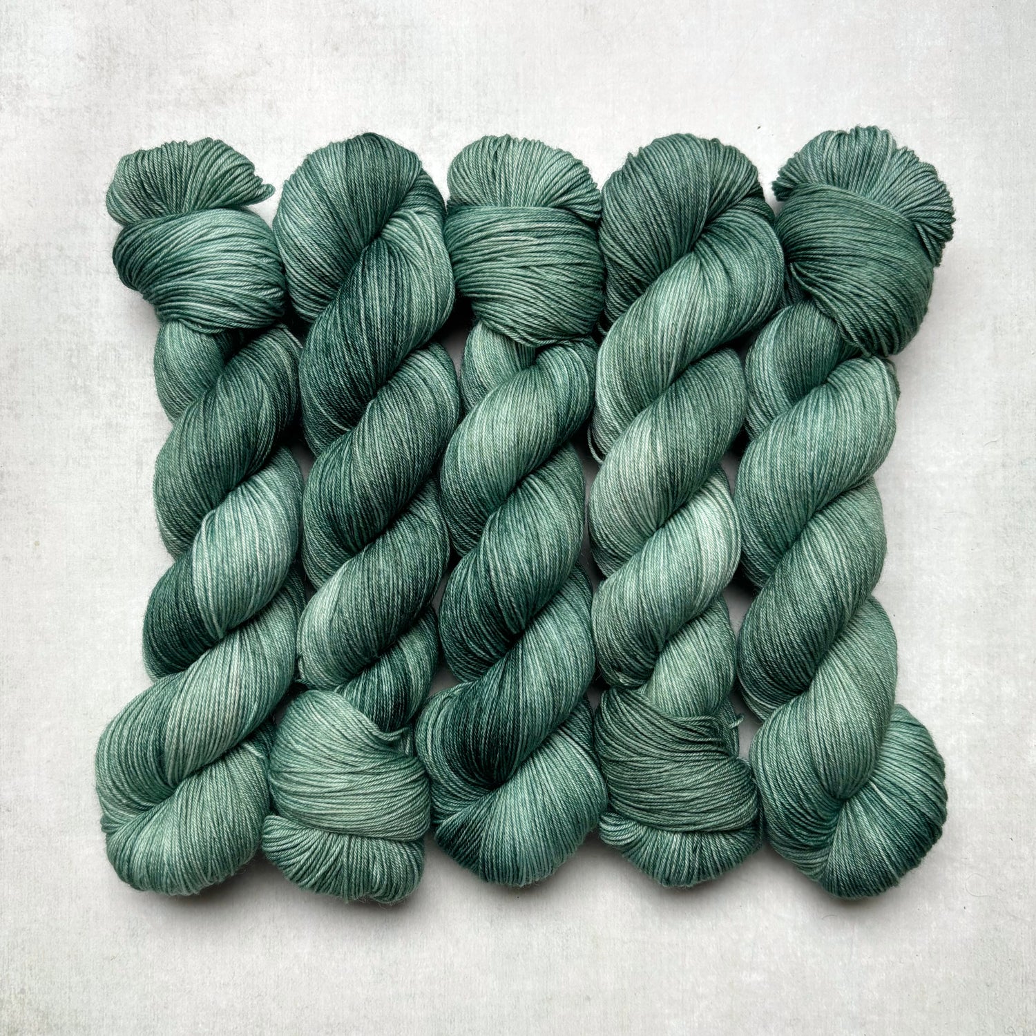 The second shade has all the grey-green, blue-green, sage, and forest tones of a classic spruce. The perfect foil for glitter and sparkle, and a shade of green that works with cool and warm contrasts. This one is called evergreen. Both are dyed on hoo | sock and there are a couple of batches ready-to-ship in the shop, with more skeins primed to dye-to-order if required!