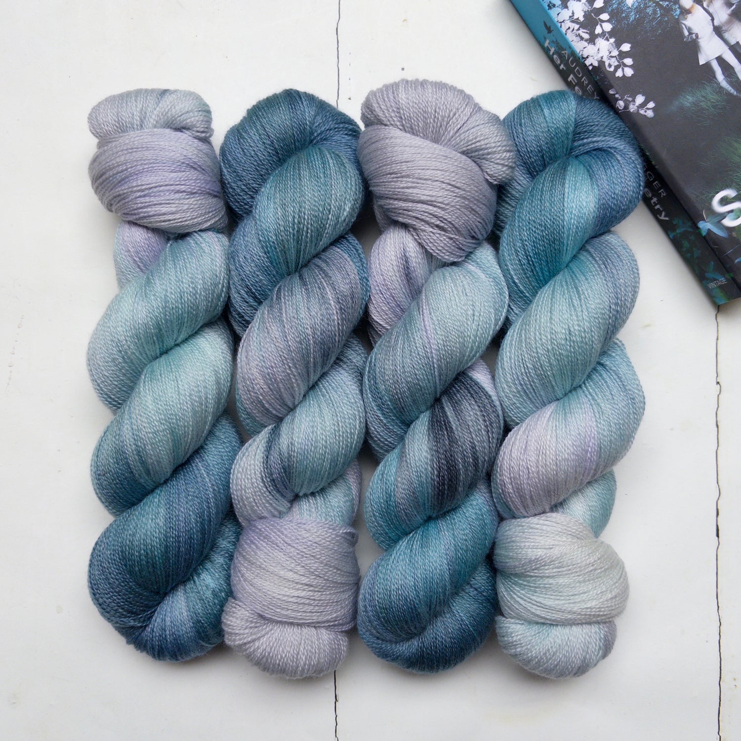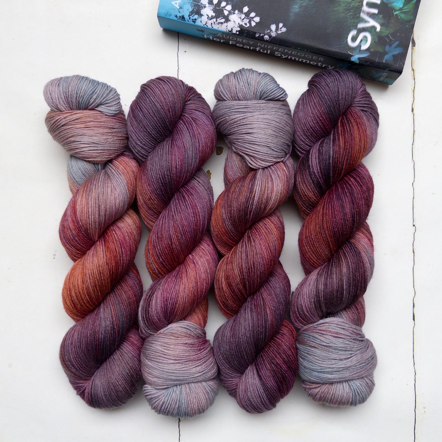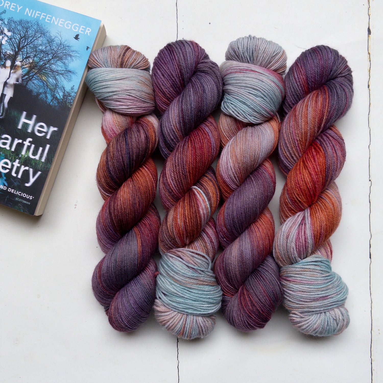 I've dyed four shades across five yarn bases, inspired by a walk in Highgate Cemetery on a crisp autumn morning. A palette of burnt orange, russet, aubergine and granite... adding an etheral minty grey/green and shades of teal and turquoise to the mix resulted in shades that, I hope, evoke the modern ghostly mood of this woderful book!